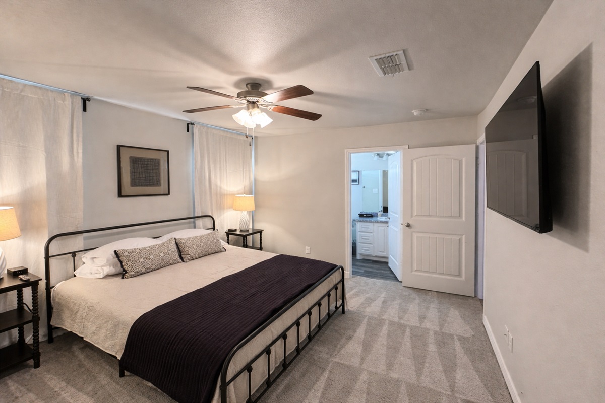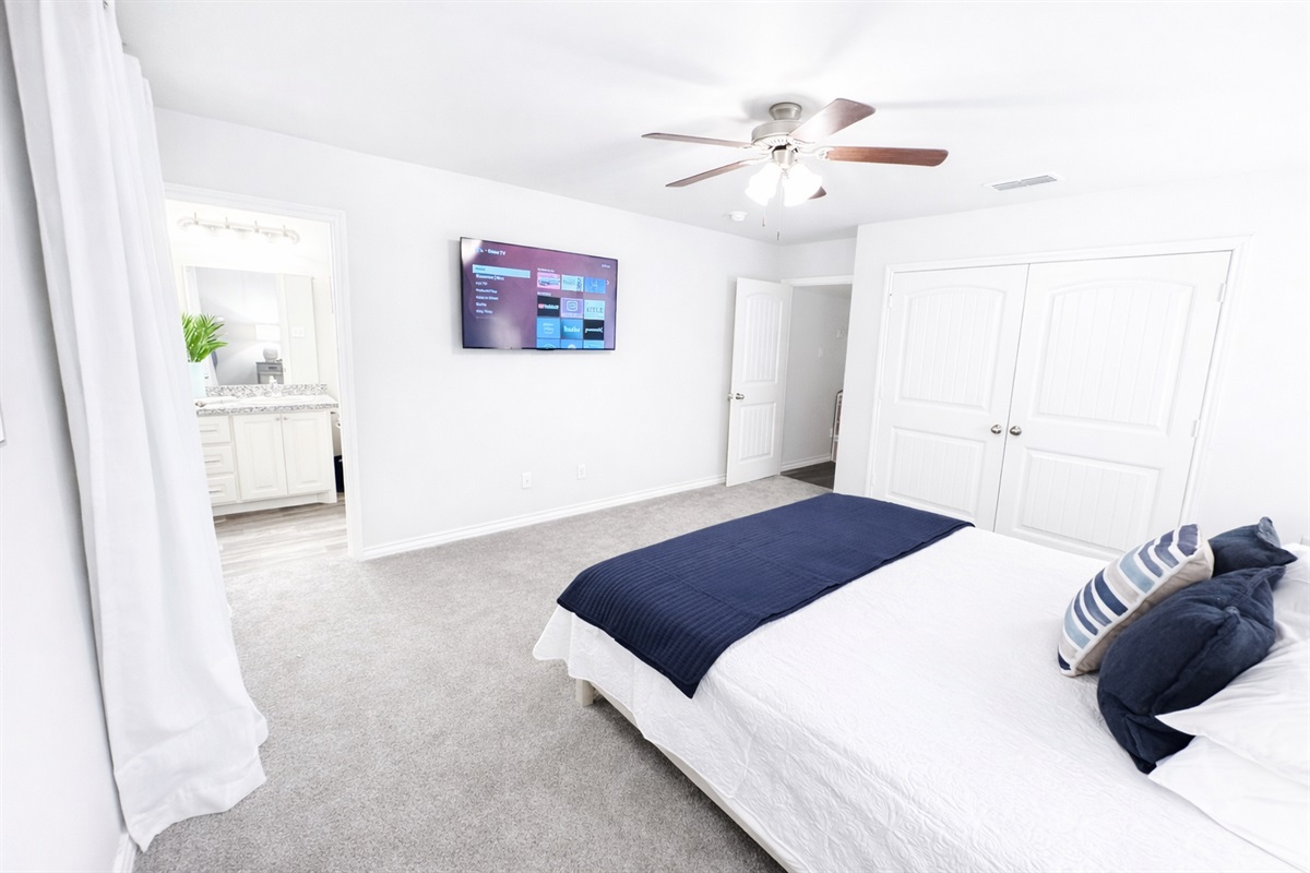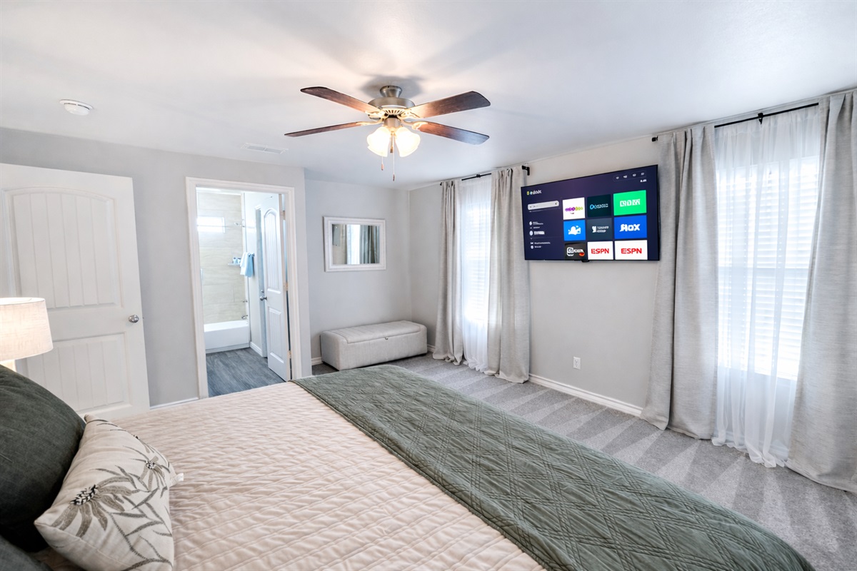 This townhouse features three spacious executive suites, each with a king bed, a private bathroom, and 5-star linens for the ultimate sleep experience. Every bedroom is equipped with large smart TVs featuring YouTubeTV, providing endless entertainment options. In addition to the three suites, the living room offers a queen sofa sleeper, making the home ideal for families or groups of up to 8 guests.