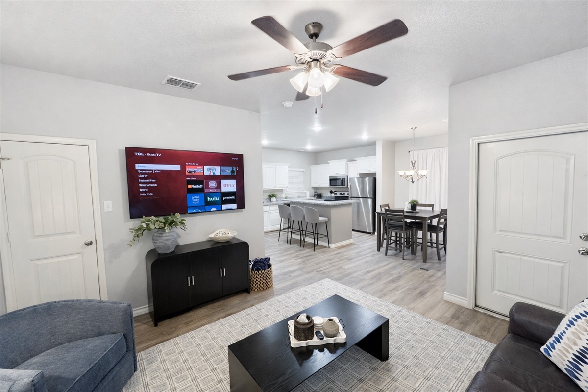 The open-concept living area is thoughtfully designed for relaxation and gathering, with a cozy sofa, 2 side chairs, and a large TV is perfect for movie nights or game days. The fully equipped kitchen is a chef’s dream, with modern appliances, ample counter space, and everything you need to prepare meals. Enjoy your culinary creations at the stylish dining area or head outside to the private backyard, where a BBQ grill and outdoor seating await.