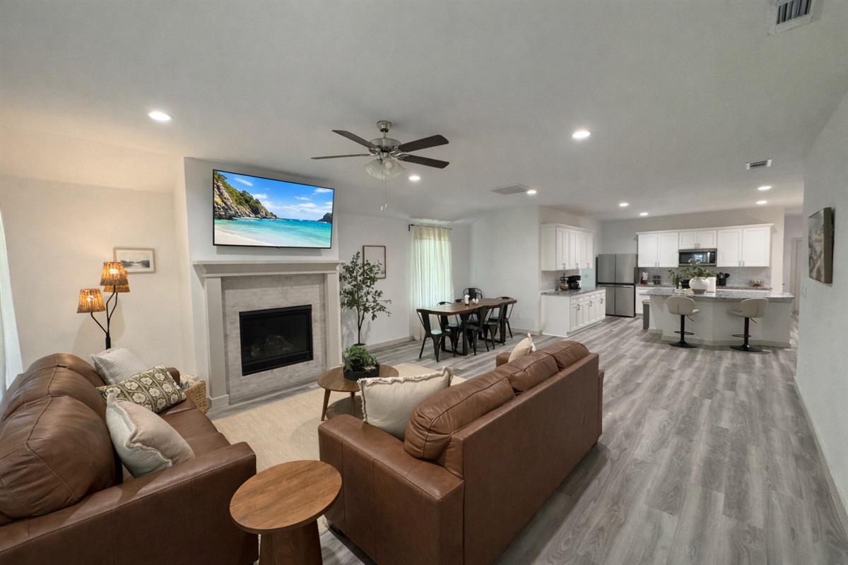 Step inside to an open-concept living, dining, and kitchen area where natural light fills the space. The spacious kitchen island is the perfect gathering spot for family meals, game-day snacks, or morning coffee before heading out to explore. Comfortable leather couches in the living room provide a cozy place to relax, while the large smart TV makes it easy to enjoy movies, sports, or your favorite shows.