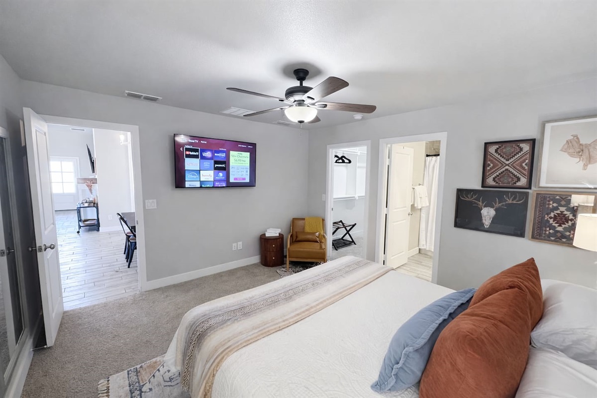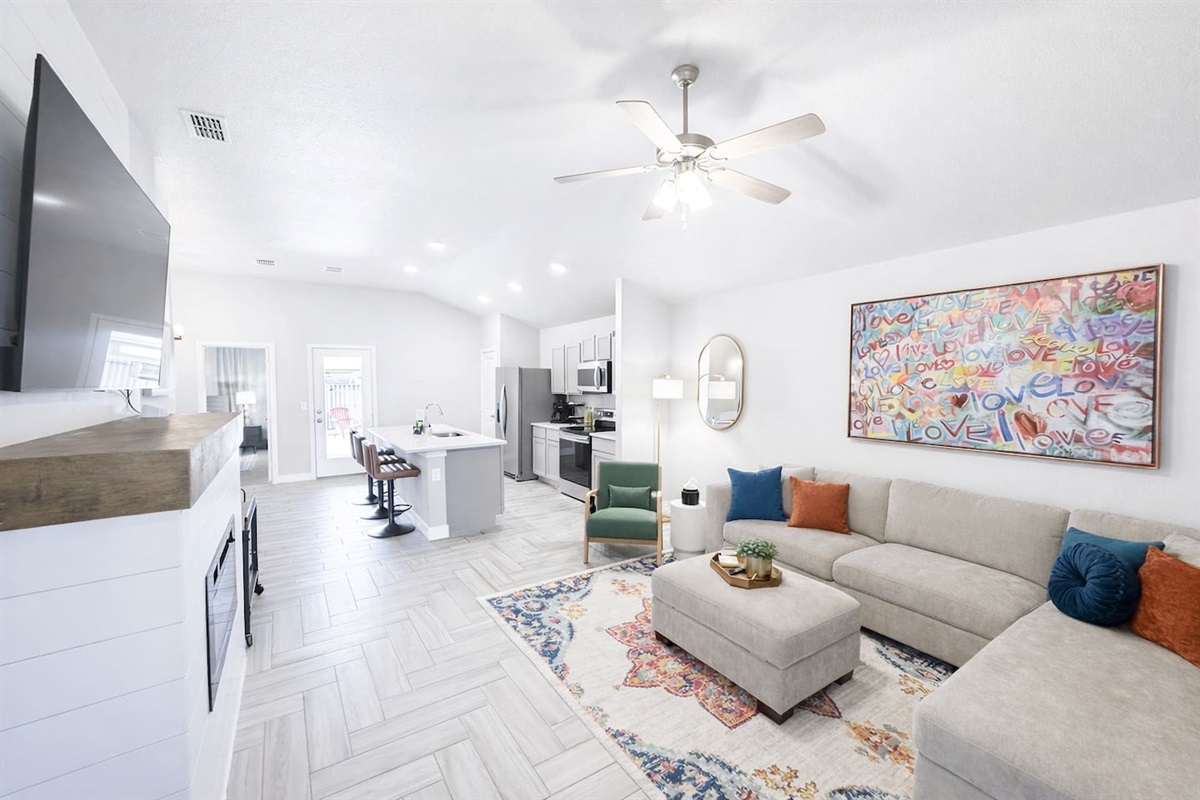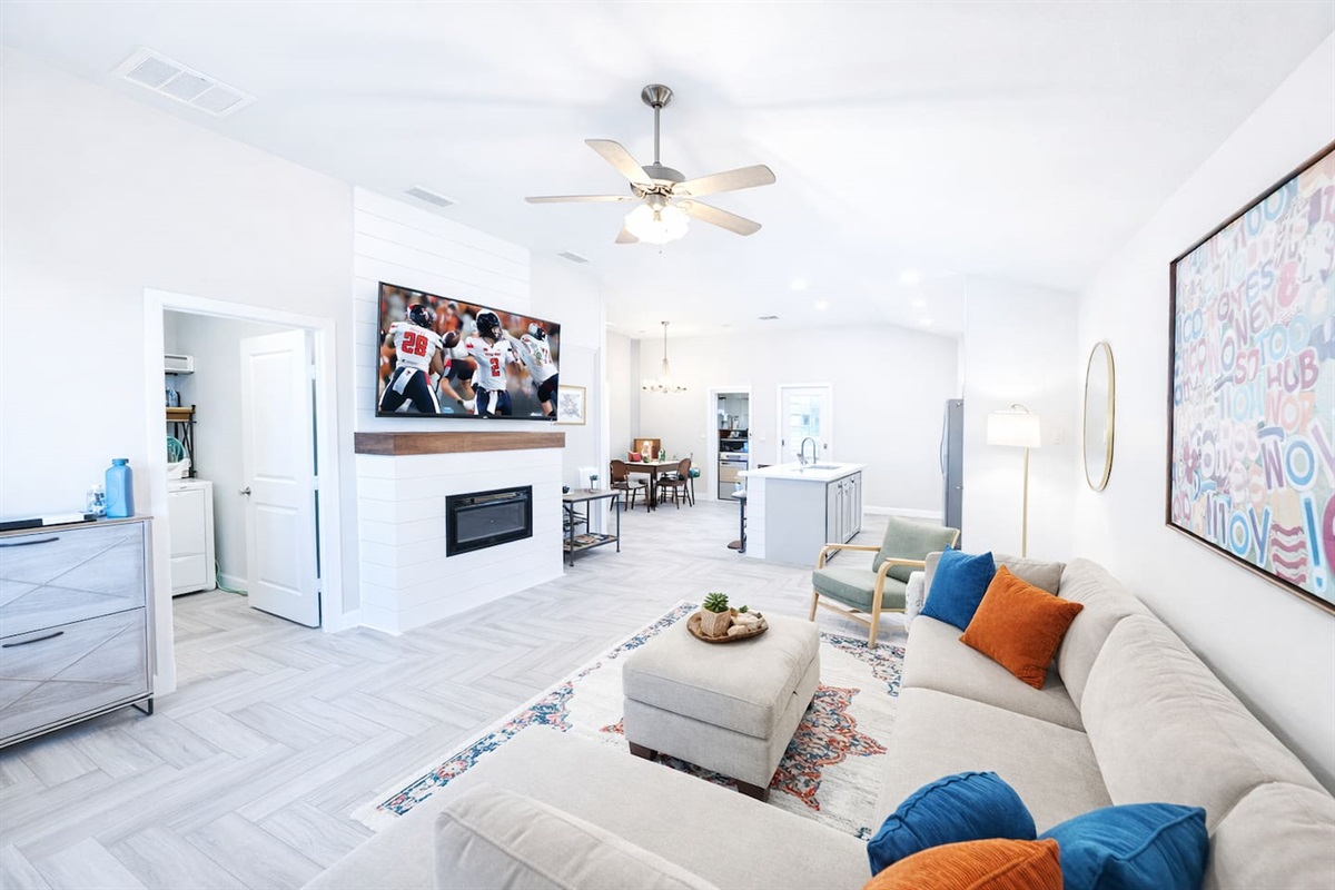 Inside, a bright open-concept layout allows the living room, dining area, and kitchen to flow seamlessly together—perfect for relaxing, gathering, or working remotely. The living room features a large sectional and wall-mounted smart TV, while every bedroom also includes its own smart TV with YouTube TV, providing access to live local channels and sports throughout the home.