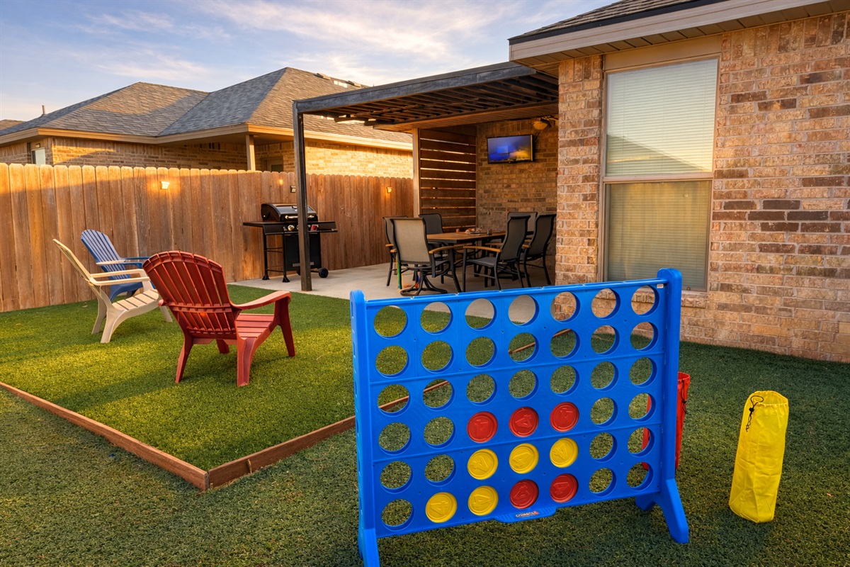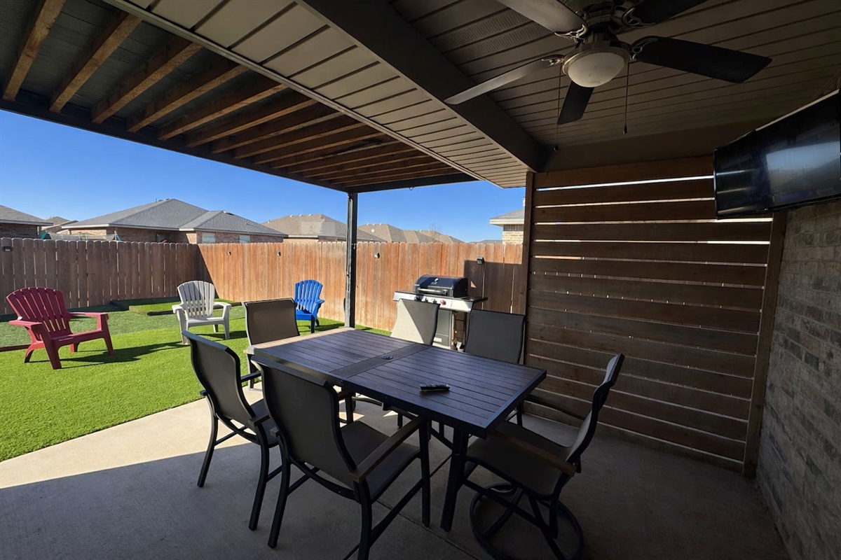 Outdoor living is a standout feature of the home. The fully fenced backyard includes artificial turf, a landscaped plant ring, and oversized outdoor family games—creating a clean, low-maintenance space that’s great for kids and relaxing downtime. The covered back patio offers comfortable seating, a ceiling fan, and a mounted TV, making it an ideal spot to unwind, watch the game, or enjoy West Texas evenings.