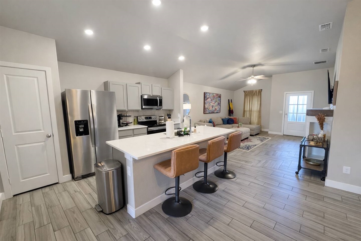 The kitchen is fully equipped for both short and extended stays and centers around an oversized island with seating. Guests will enjoy full-size appliances, generous counter space, and a dedicated coffee station stocked for easy mornings.