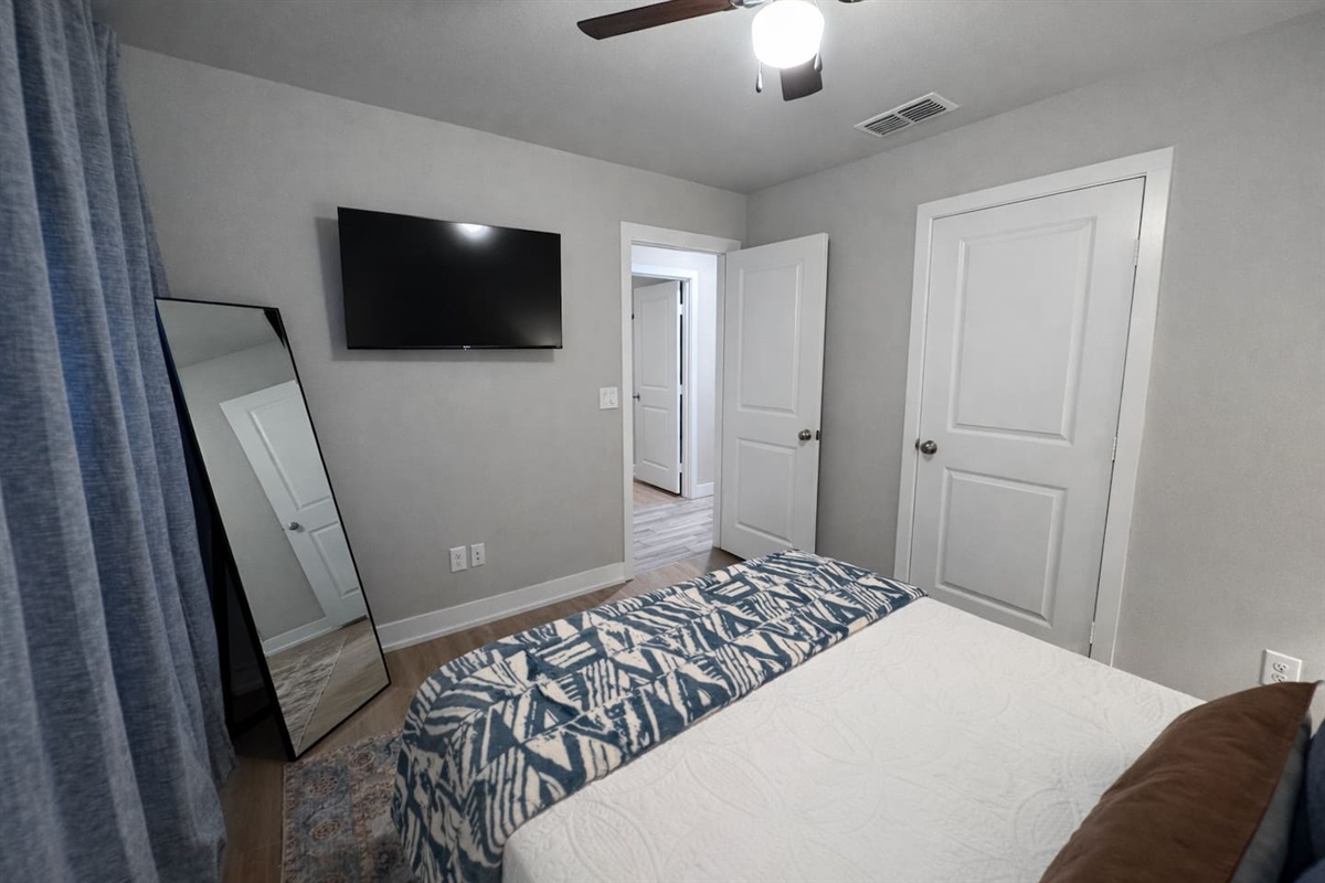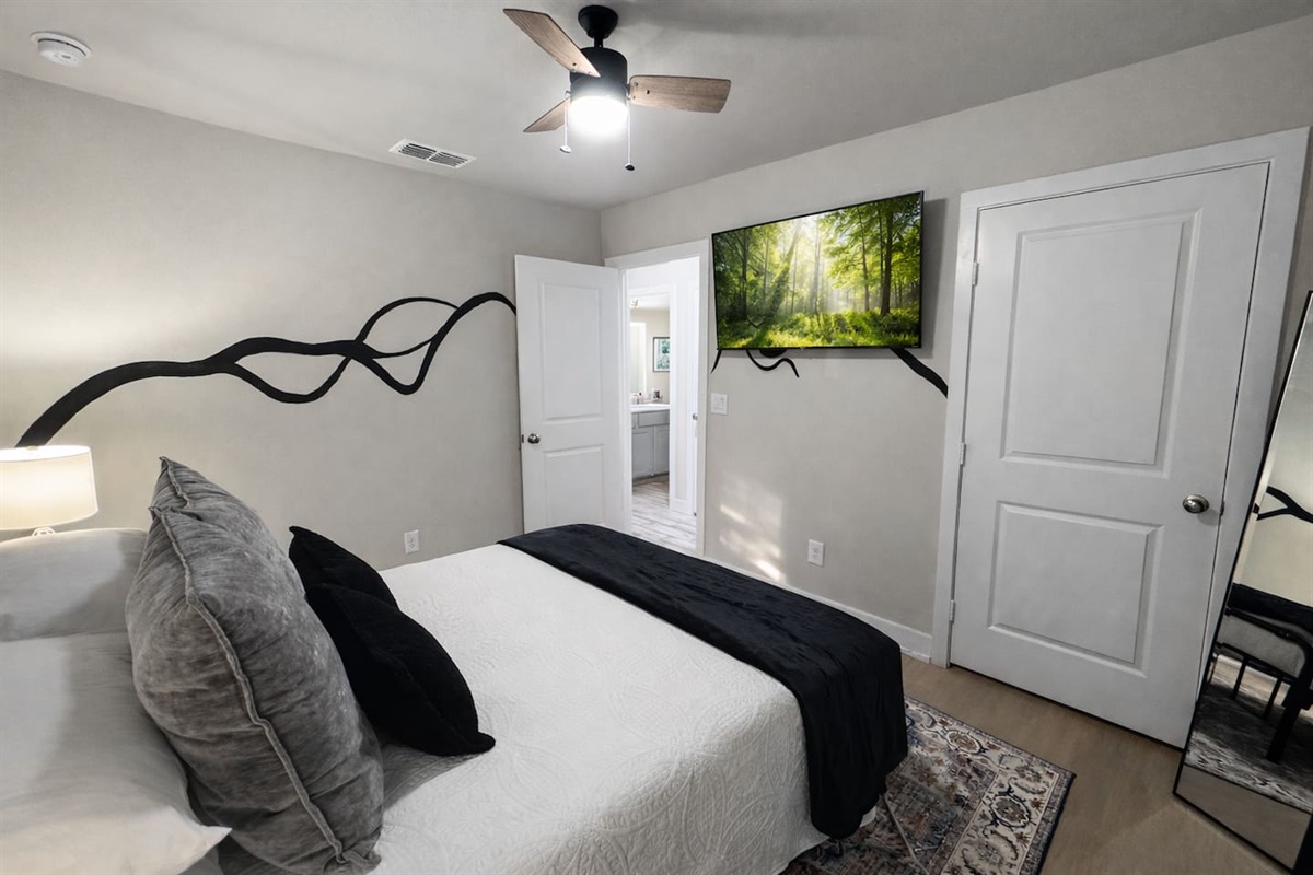 • One bedroom with a queen bed